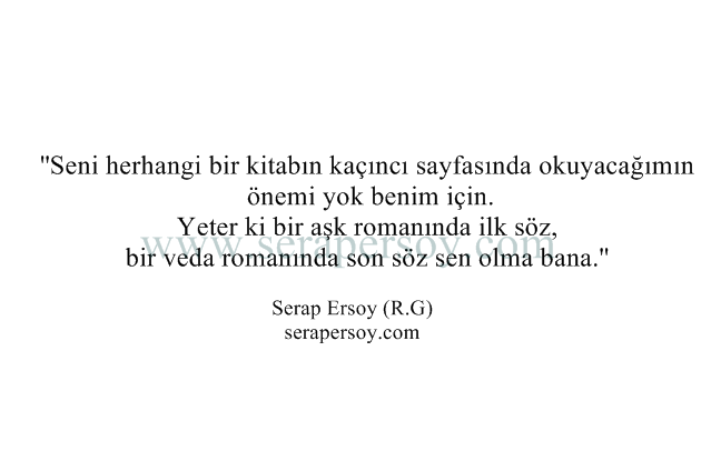 ''Seni herhangi bir kitabın kaçıncı sayfasında okuyacağımın önemi yok benim için. Yeter ki bir aşk romanında ilk söz, bir veda romanında son söz sen olma bana.'' Serap Ersoy (Ruhum Güneşten)